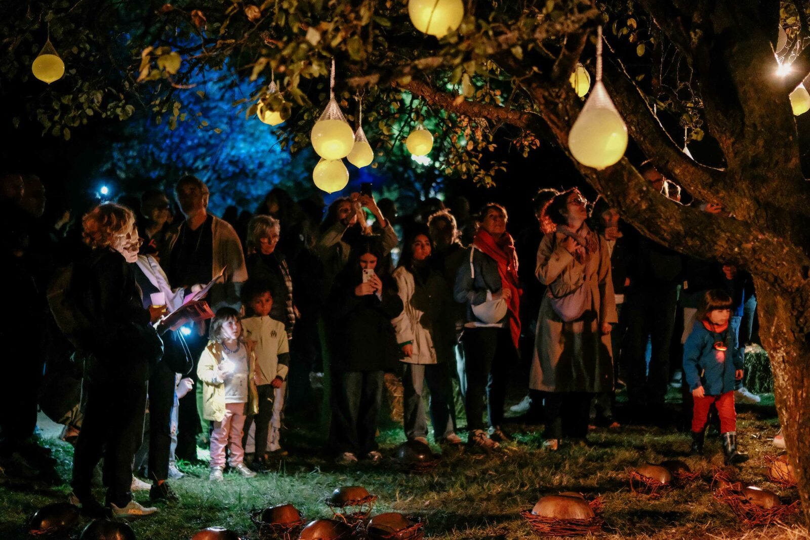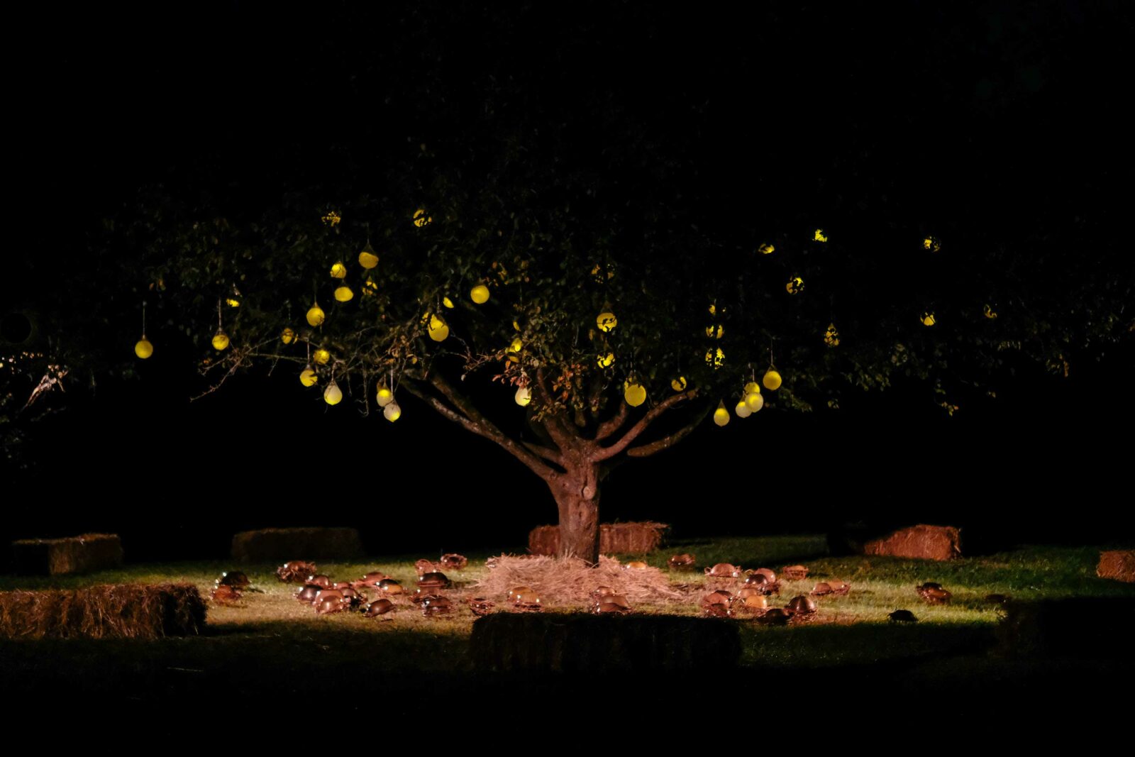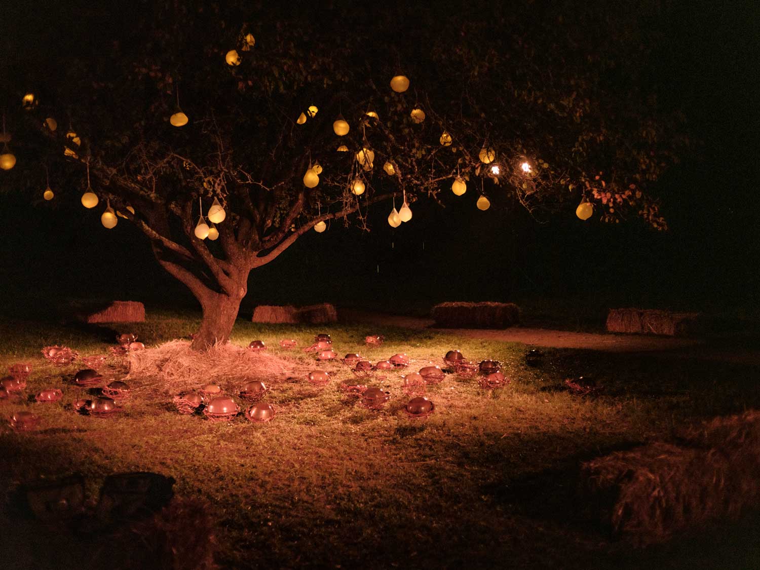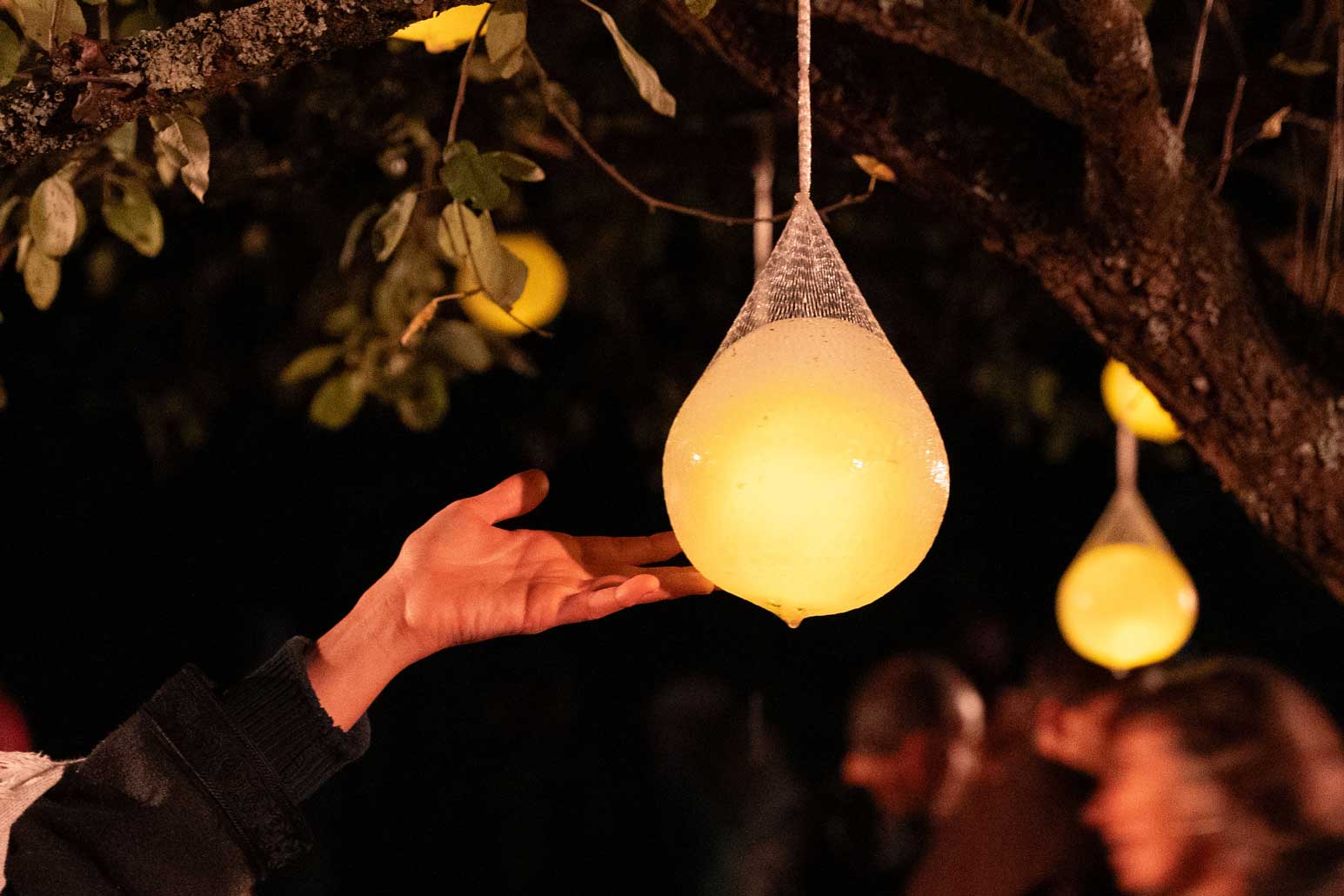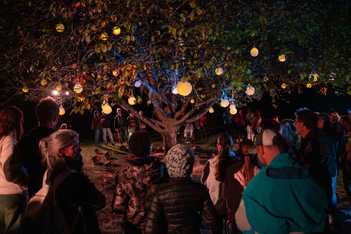 Ces fruits lumineux sont faits de glace, leur fonte marque le temps qui passe, goutte après goutte. Le temps d’une nuit, ils illuminent les branches, nous invitent à plonger dans nos souvenirs et à écouter le présent. Une invitation à contempler l’arbre et à lui tendre l’oreille, à écouter la nuit et ses secrets.