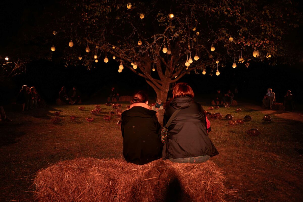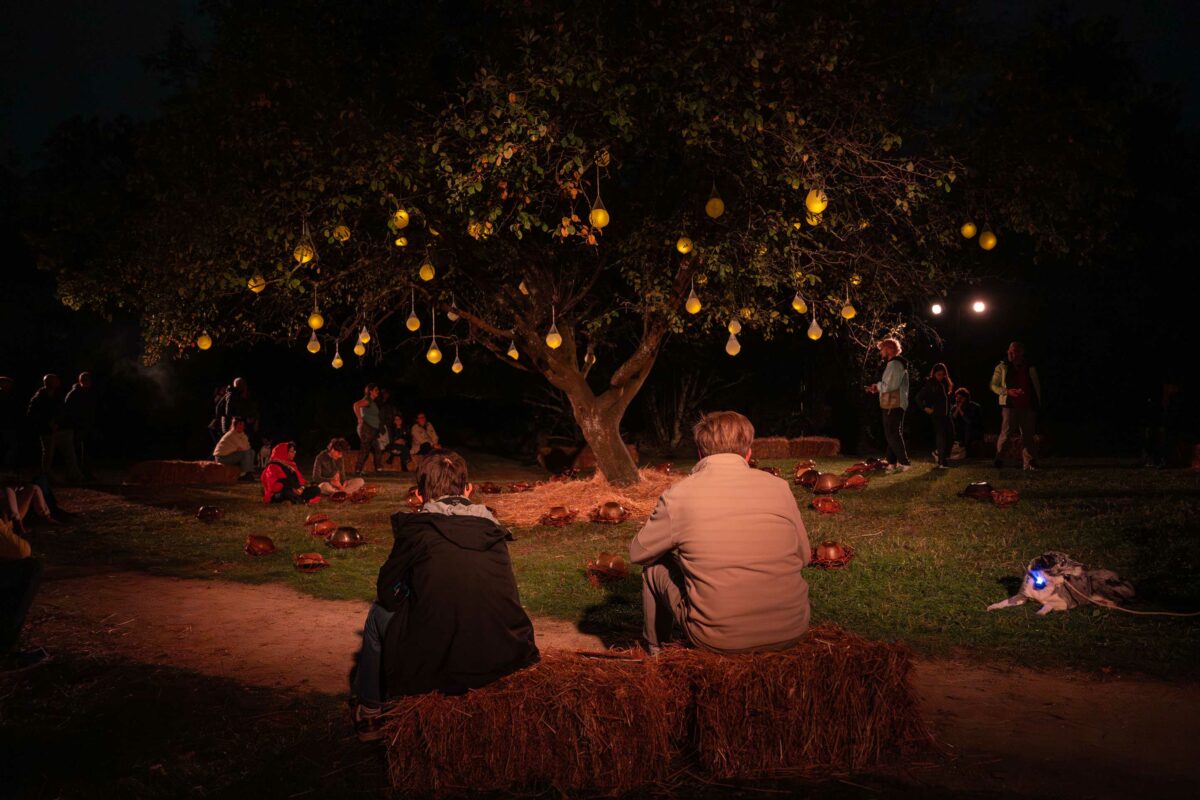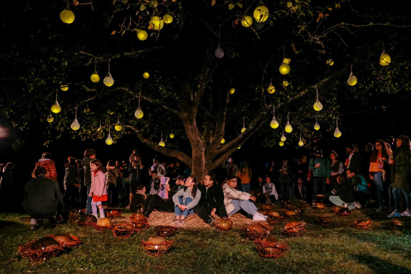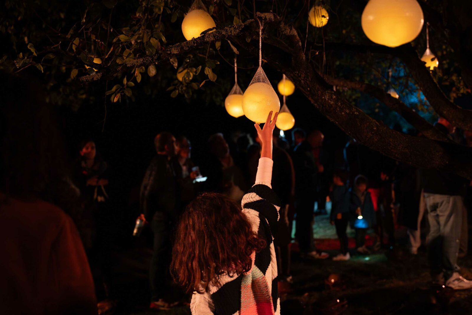 Ces fruits lumineux sont faits de glace, leur fonte marque le temps qui passe, goutte après goutte. Le temps d’une nuit, ils illuminent les branches, nous invitent à plonger dans nos souvenirs et à écouter le présent. Une invitation à contempler l’arbre et à lui tendre l’oreille, à écouter la nuit et ses secrets.