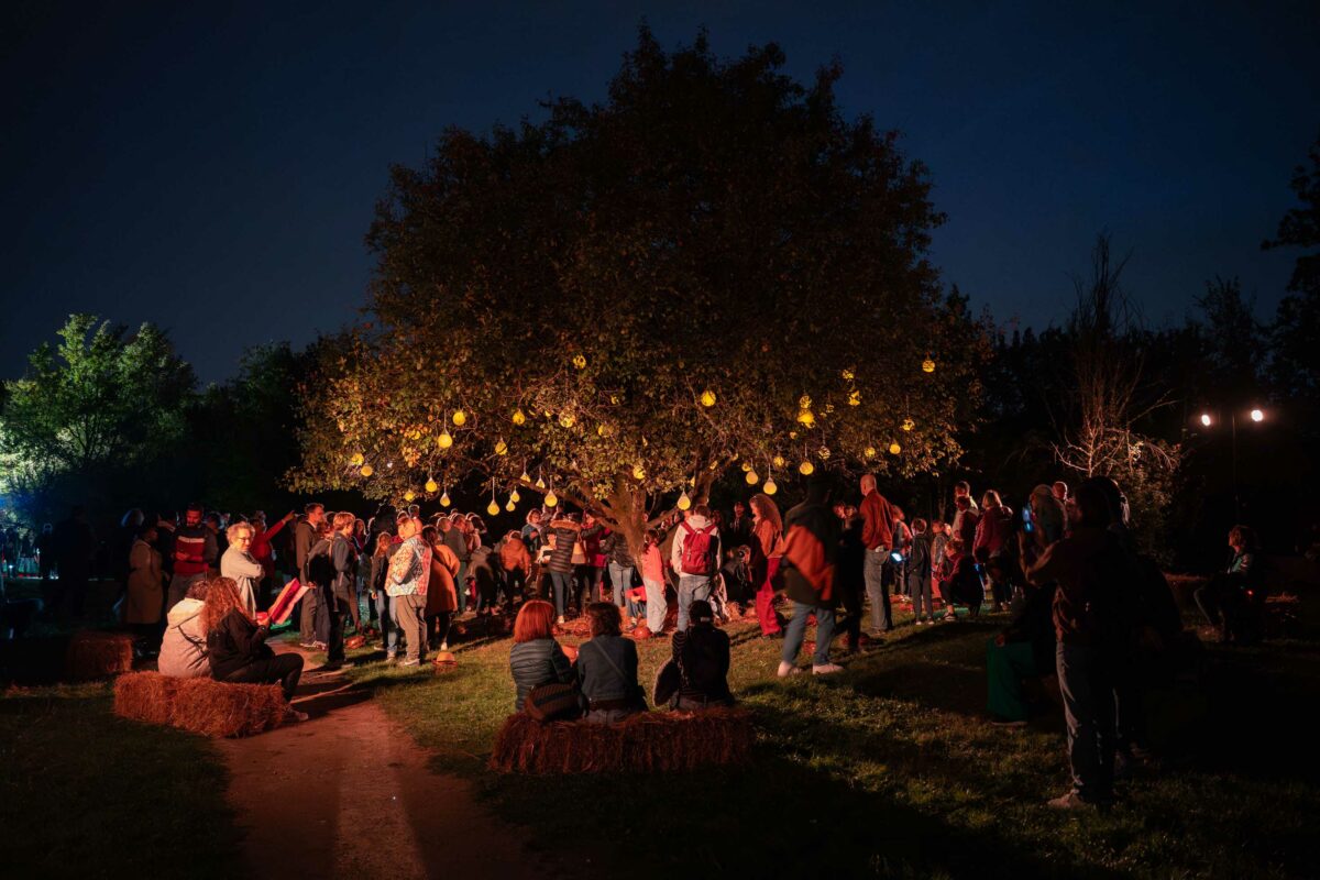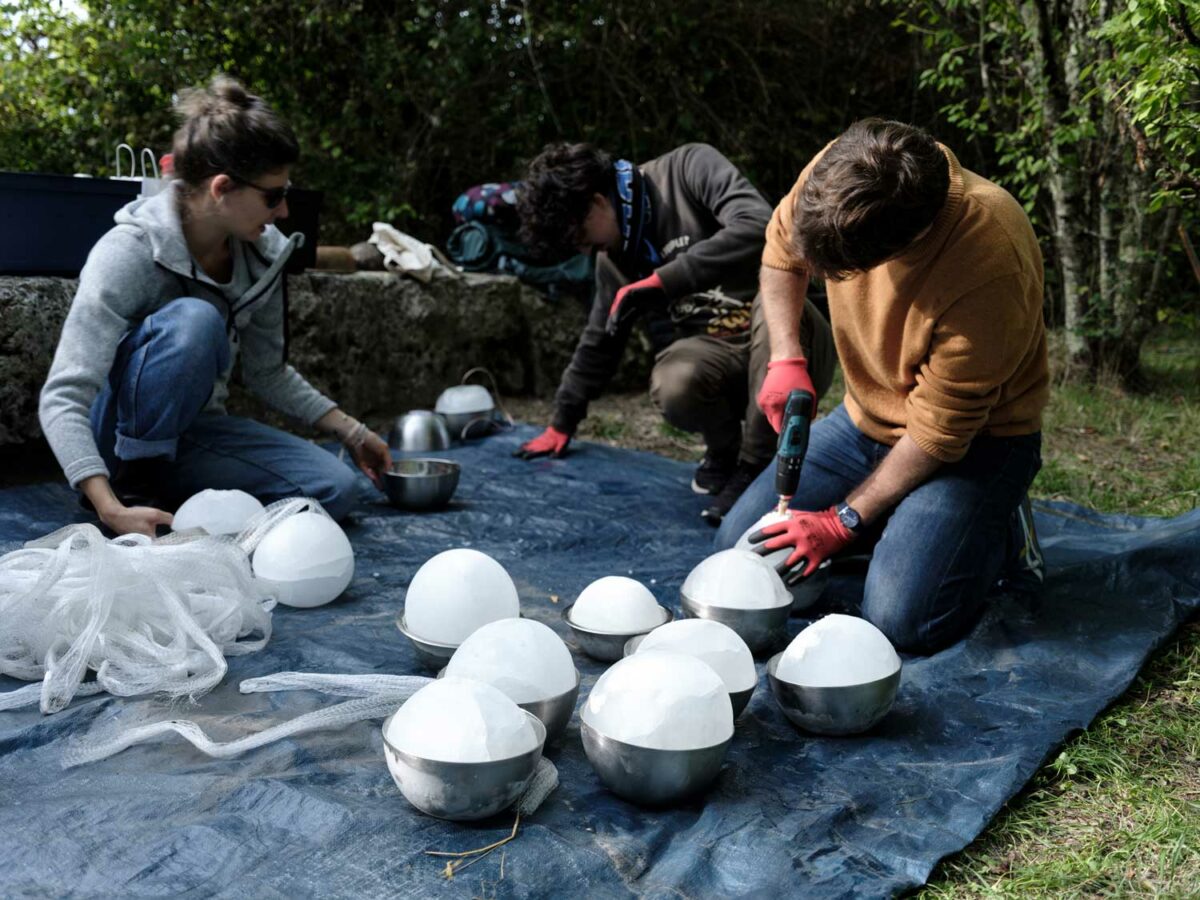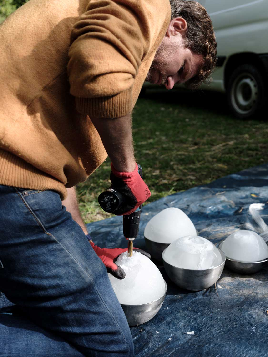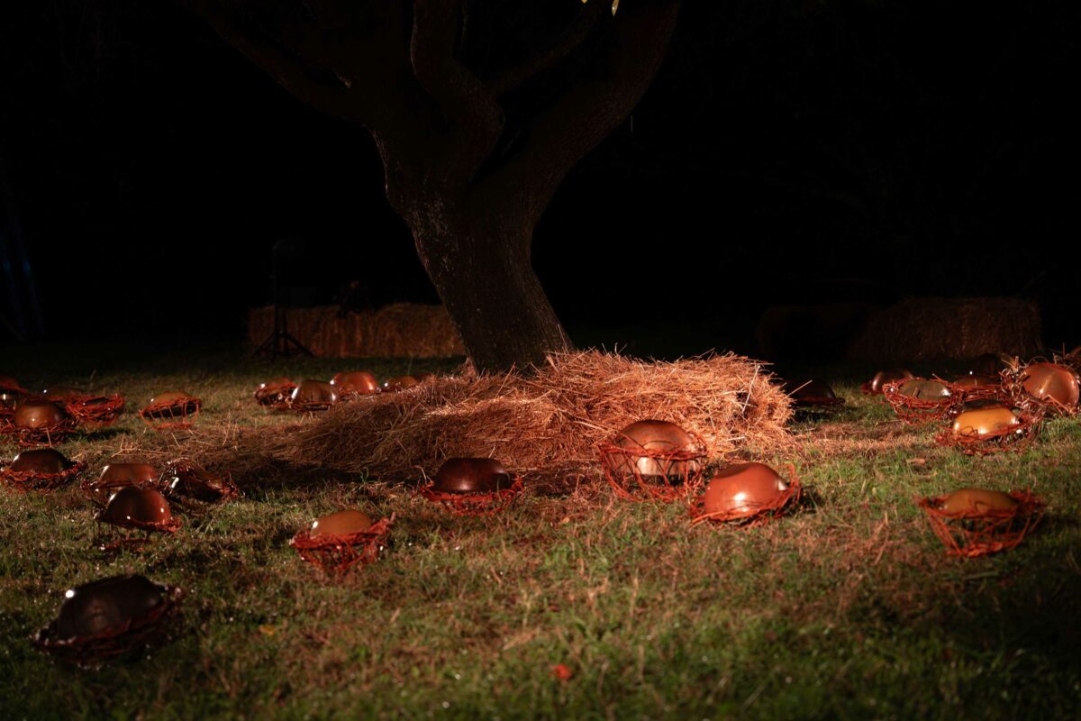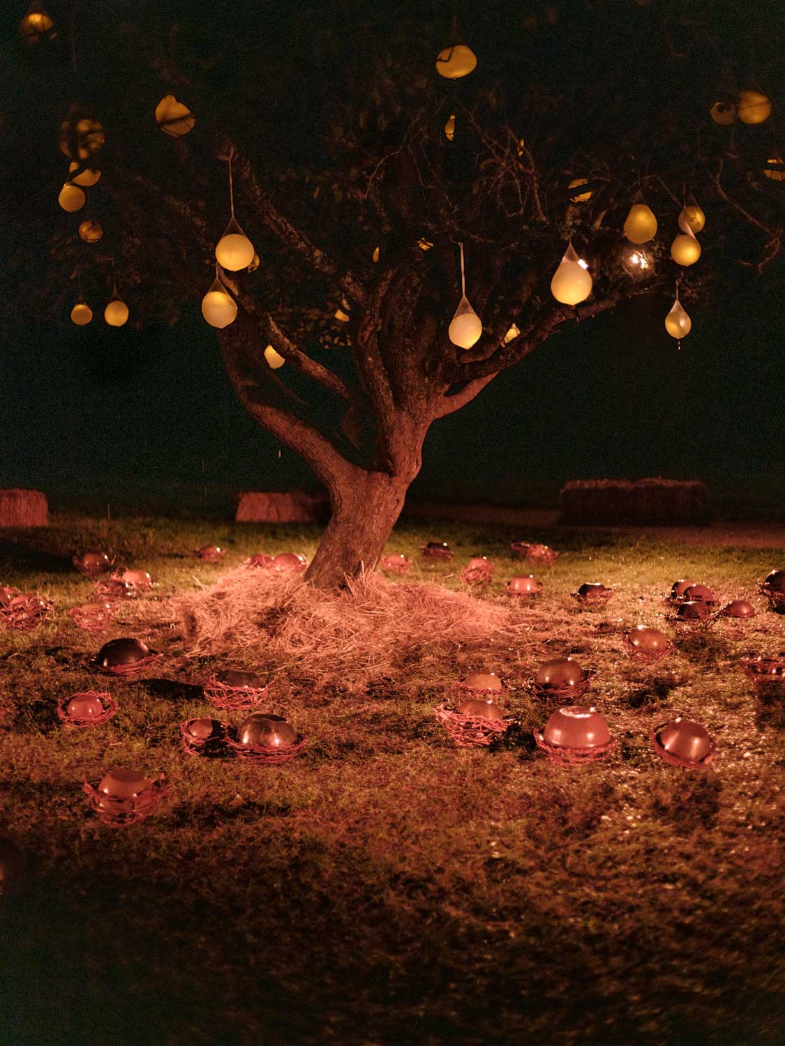 Ces fruits lumineux sont faits de glace, leur fonte marque le temps qui passe, goutte après goutte. Le temps d’une nuit, ils illuminent les branches, nous invitent à plonger dans nos souvenirs et à écouter le présent. Une invitation à contempler l’arbre et à lui tendre l’oreille, à écouter la nuit et ses secrets.