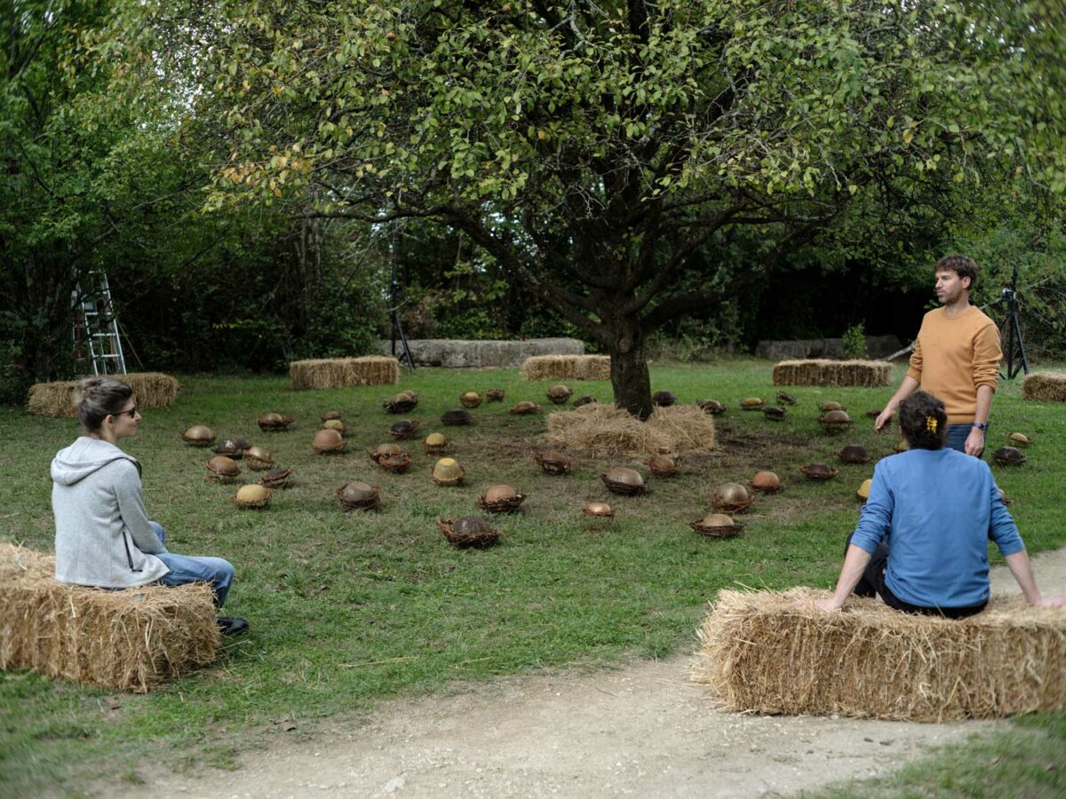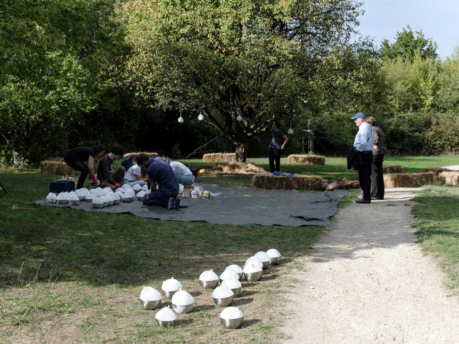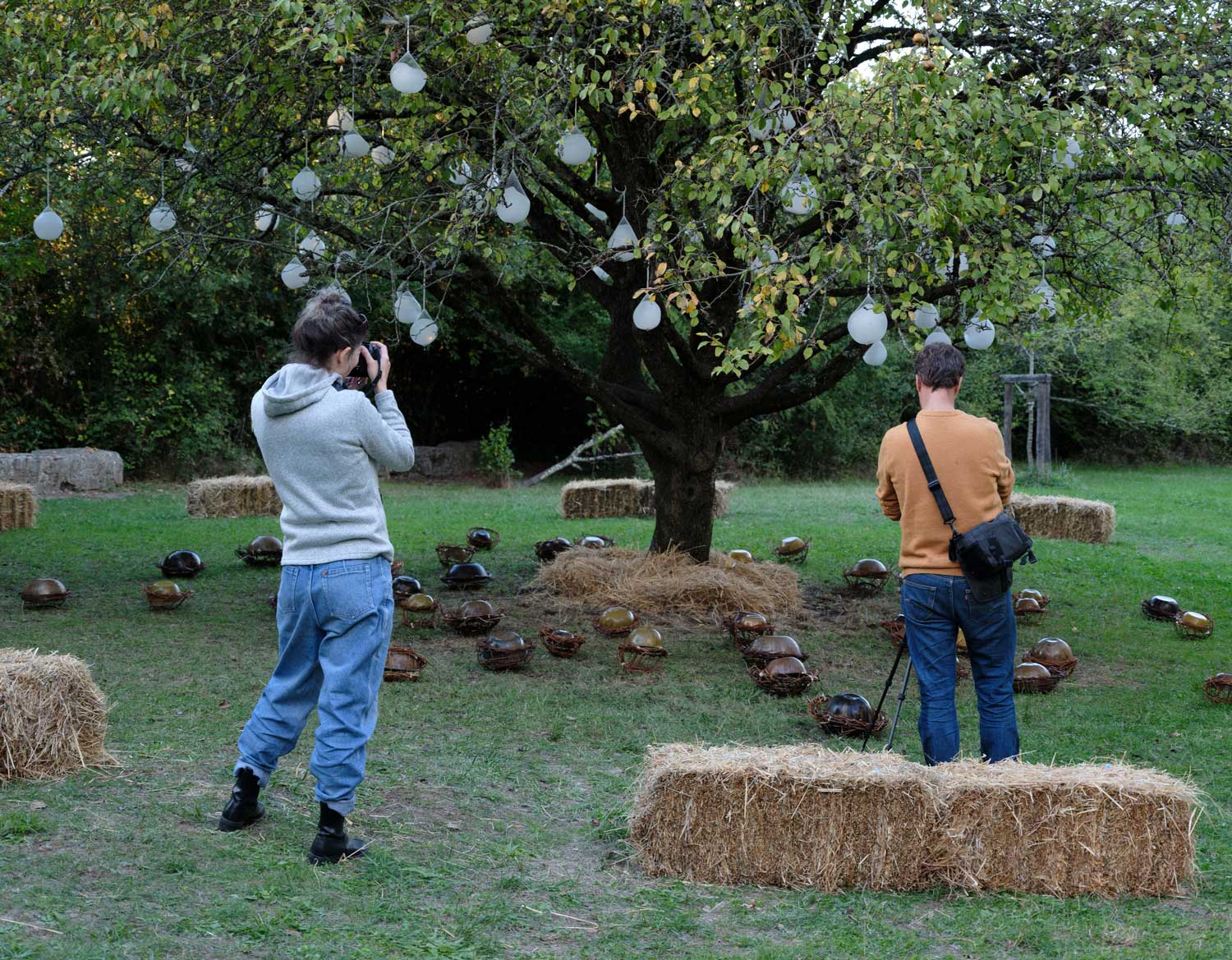 Depuis ses hauteurs, un poirier du parc de l’Ermitage produit une étrange mélodie entêtante : des gouttes d’eau tombent de fruits extraordinaires sur des tambours métalliques, positionnés tout autour de son tronc.