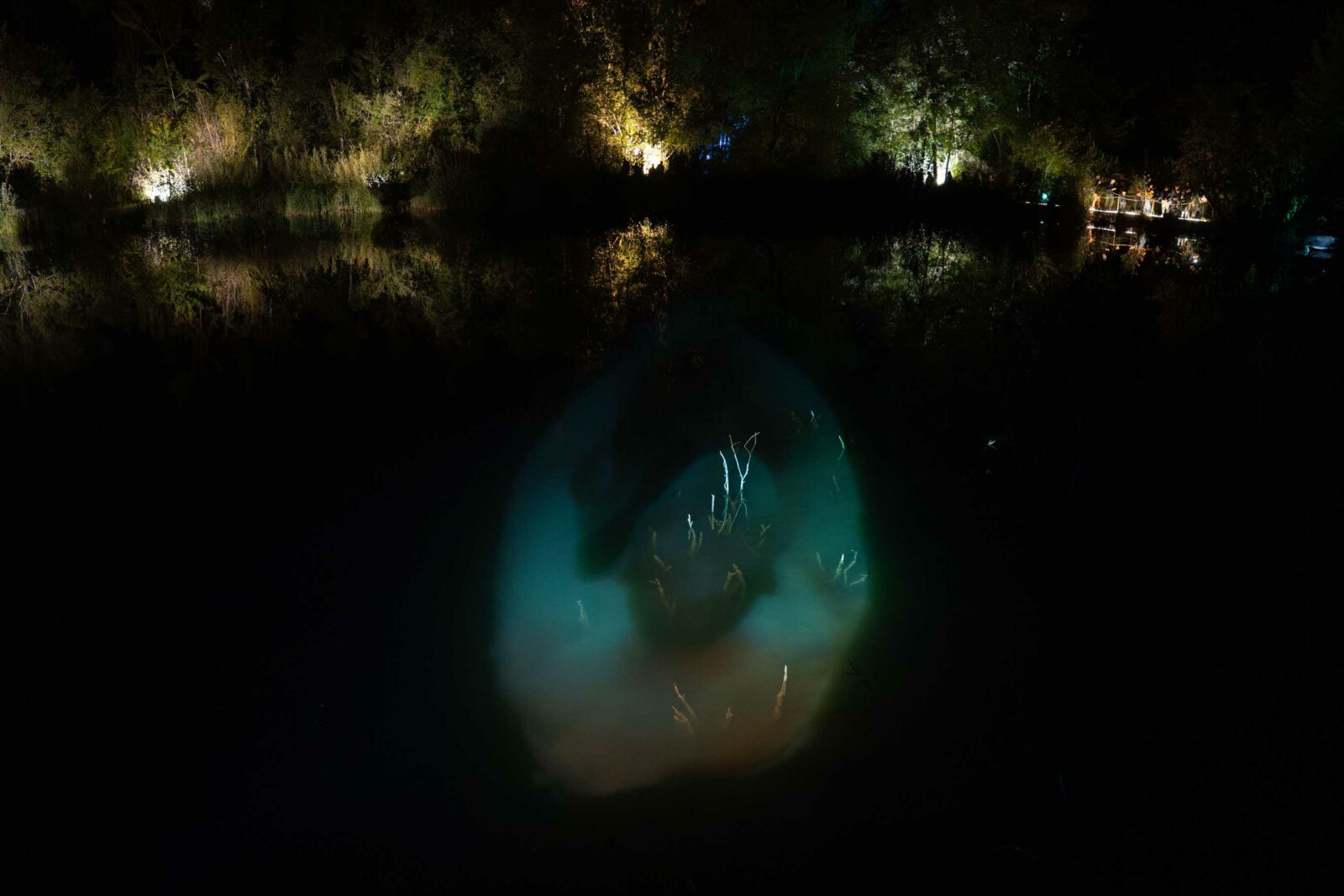 « À l’époque, il faisait toujours beau en septembre et j’avais touché l’eau du bout du pied en projetant les mains et les pieds ‘d’un géant’ sur la rive. Ma curiosité d’explorer le lac était restée en germe. Depuis, le climat, plus imprévisible, a favorisé l’apparition de nouveaux habitants et espèces végétales et animales, autour et dans le lac. Pour cette Nuit Verte, je souhaite créer une œuvre inspirée de ce que j’ai observé dans l’eau et aux abords du lac, de la pluie, du vent qu’il y aura pendant l’hiver. »